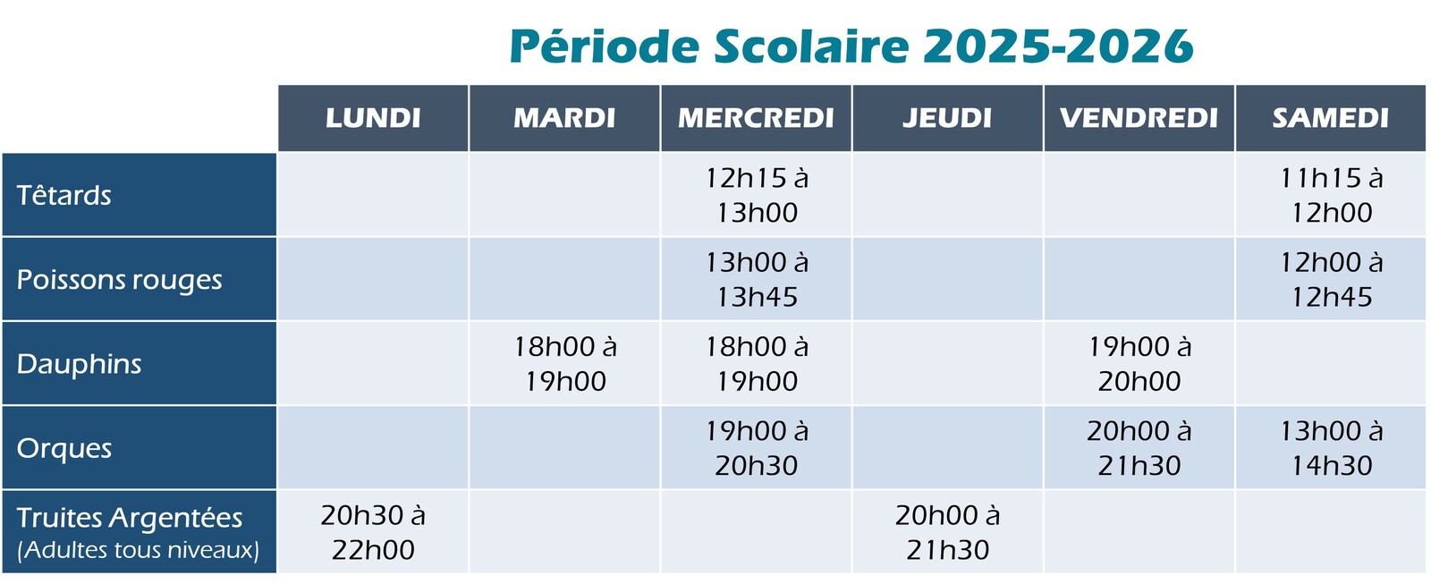 En complément de la construction de noueaux groupes de nage, de nouveaux horaires seront mis en place dès la rentrée de Septembre 2025.